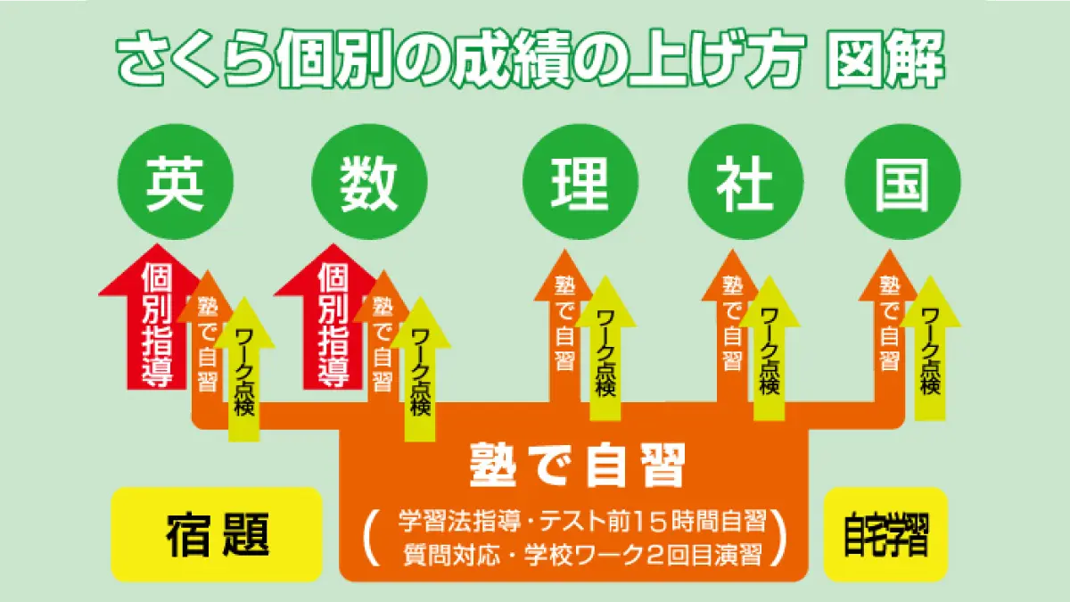 個別指導塾において5科目全て1対2の授業を毎週受講するというのは、時間的にも費用的にも現実的ではありません。1~2教科の授業を受講して、残りの教科は自学自習で点数を上げていくのが基本です。授業を受けていない教科の点数もしっかり上げて、内申全体を上げていくために当塾では下図のような体制で指導を行っています。