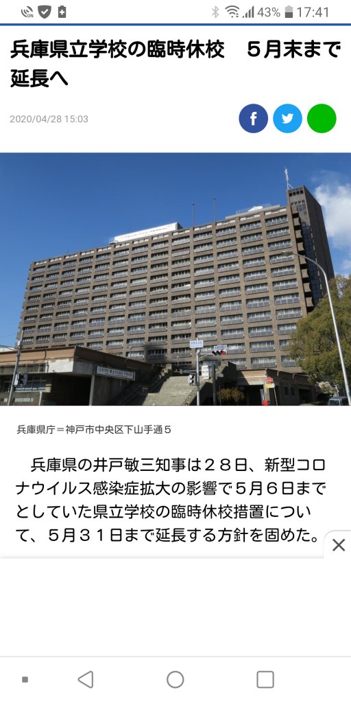 兵庫県立学校の臨時休校、5月末まで延長へ 夕方にも正式決定。西宮市は市立学校園の休校期間を5月末まで延長( 市立高校除く)