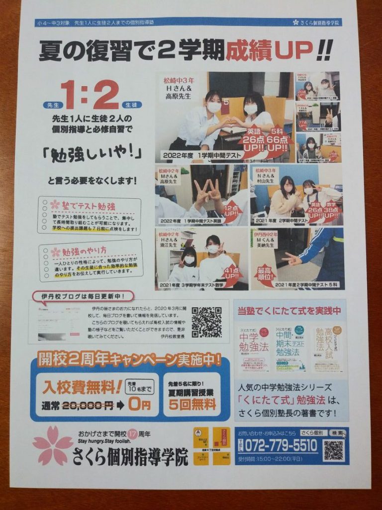 こんにちは。 伊丹の個別指導塾、さくら個別指導学院、 伊丹校です。 今週は、塾カレンダーではお休みですが、 3年生の自習と、体験授業などで教室を開けています。 お陰様で夏休みが終わってからも、問い合わせや体験授業をすることが増え 今回の... -