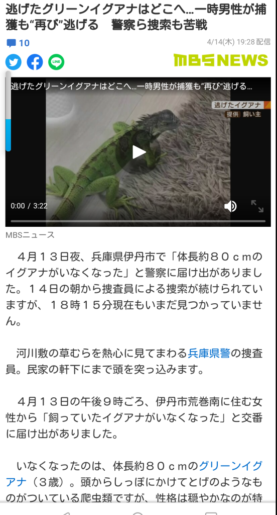こんにちは。 伊丹の個別指導塾、さくら個別指導学院 伊丹校です。 ネットニュースです。 伊丹市荒牧南2の戸建て住宅からペットのイグアナが逃げ出したようです。 14日もまだ捕獲されておらず、 付近を伊丹警察署員が捜索しているようです。 体長... -