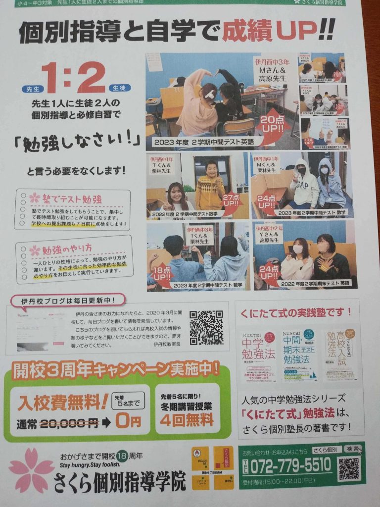 こんにちは。 伊丹の小中学生の個別指導塾、さくら個別指導学院 伊丹校です。 気付けば、年内の授業は明日28日までです。 ちょっと早いかな・・・ 年明けからの冬期講習は 1月4日スタートです。 体験授業は4無料で受講できますが、 あと数人でした... -
