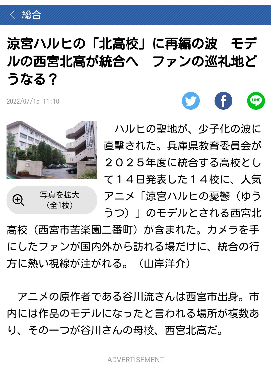 西宮北高は「涼宮ハルヒ」シリーズのモデルとして、有名ですね。