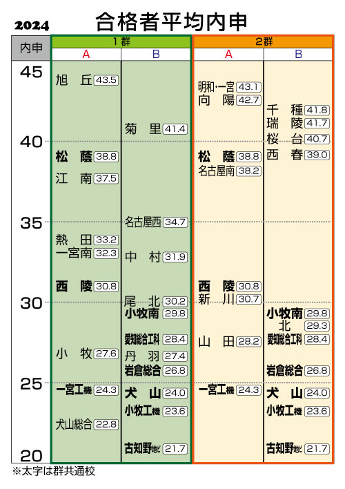 で、「高蔵も新川もなるべく避けたいぞ」という展開になれば、西春から1つ下げて「江南(合格者平均内申37.5)ー名古屋西(合格者平均内申34.7)」という受験校に変えることも出来ますよね。