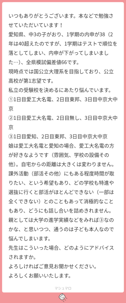 私立高校の受験組み合わせの相談ですね。愛知って私立高校を3校受験出来るんです。これは全国的に見ても多い方みたいです。通学圏に多く学校がある都道府県は多めですよね。