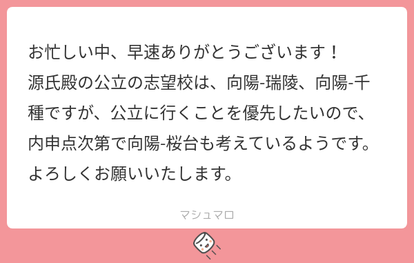 で、この返信をするために私は「公立高校の受験予定校を第二志望とあわせて教えてください!」と送りました。第一志望の具合がわからないと、私立高校も決めにくいですからね。